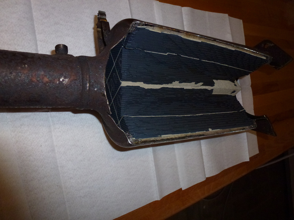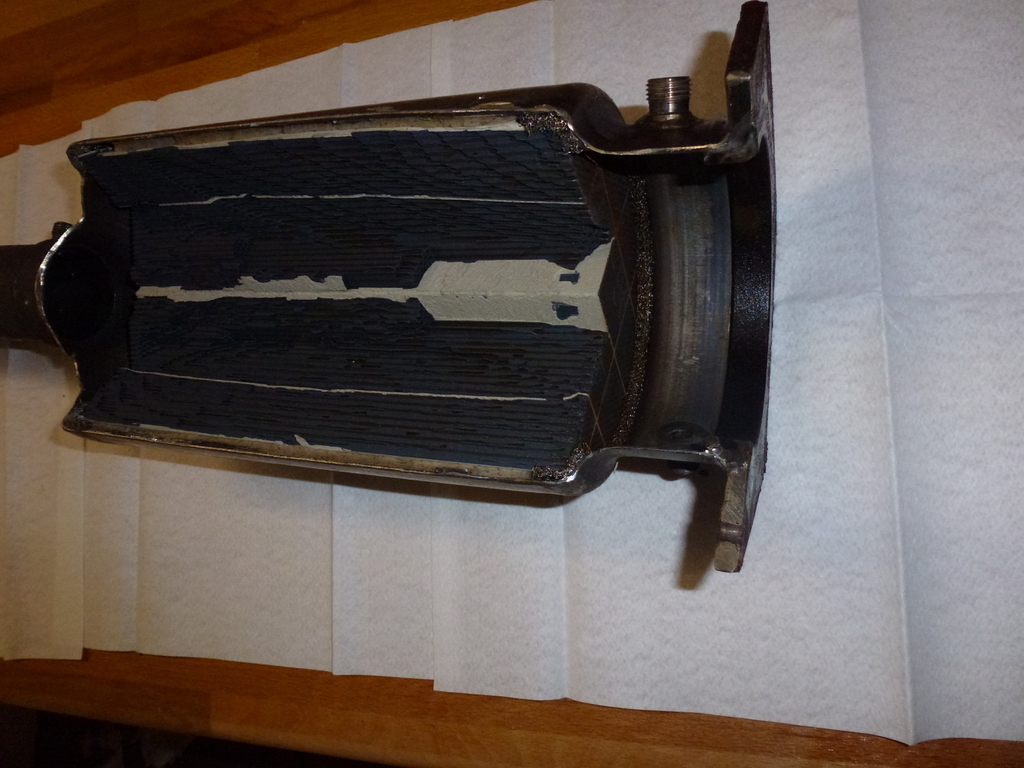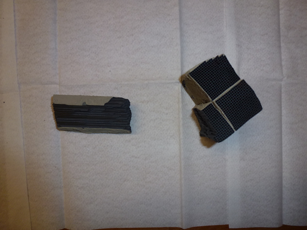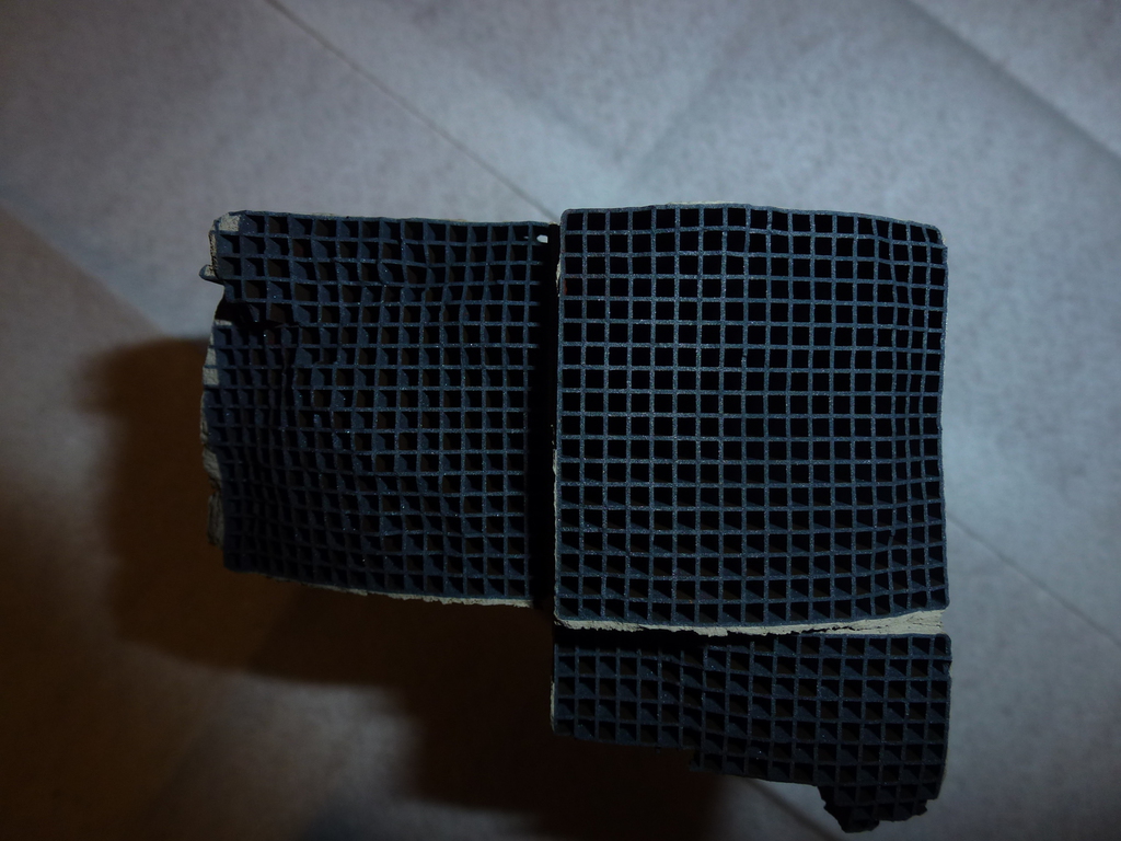 Hier ist ein eigen angefertigtes Muster eines VW Rußpartikelfilters mit über 200.000 gefahrenen Kilometern. Zu sehen ist die Wabenstruktur und deren innerer Aufbau. Die Bilder wurden Nach der Reinigung aufgenommen.